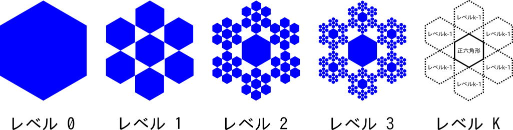 - レベルkの結晶(k>0) = レベル(k-1)の結晶×6個 + 中央の正六角形
